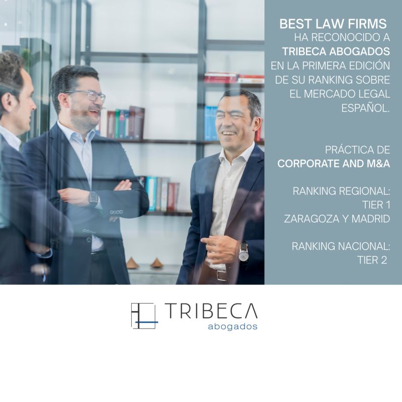TRIBECA ABOGADOS ha sido incluido en el ranking Best Law Firms Spain 2026 en la categoría de Corporate and M&A, con mención en Tier 1 a nivel regional para Madrid y Zaragoza, y Tier 2 a nivel nacional.