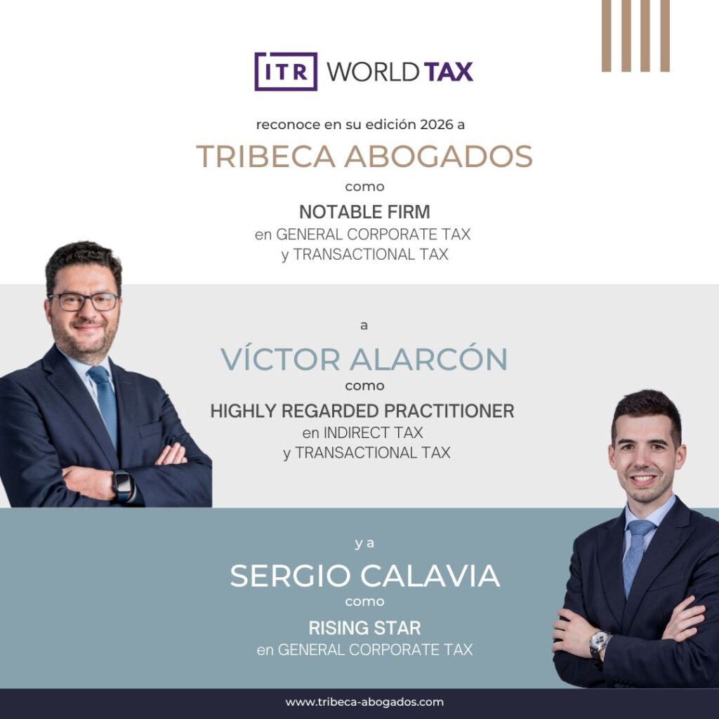 El directorio internacional ITR World Tax ha reconocido en su edición 2026 a TRIBECA ABOGADOS, destacando además las trayectorias individuales de Víctor Alarcón, como Highly Regarded Practitioner, y Sergio Calavia, como Rising Star.